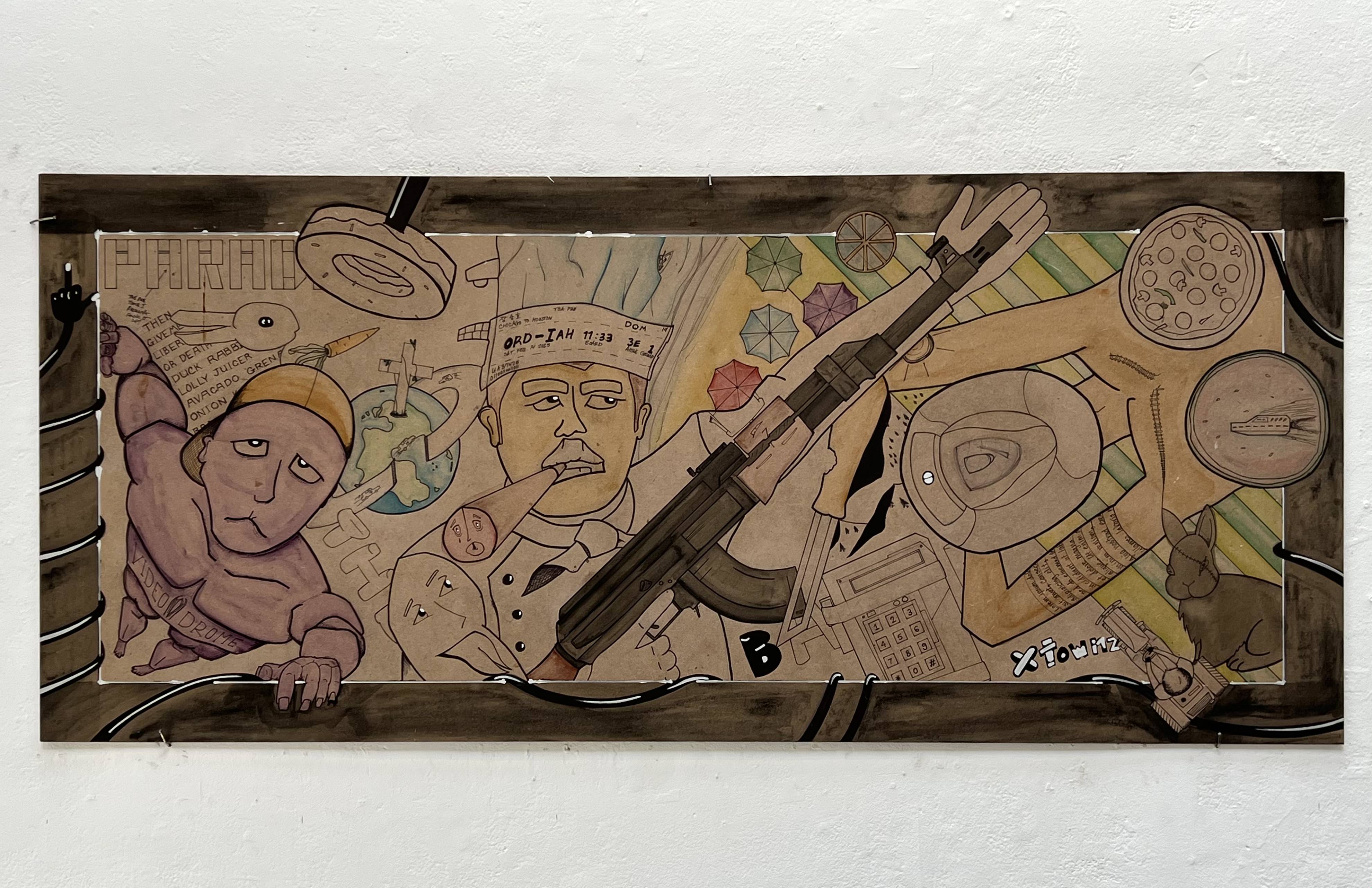 Spaghetti0s features a depiction of Chef Boyardee wielding an AK-47 and smoking a cigar. The composition is filled with fractal-like images that shift across various scales, guiding the viewer through a series of visual transitions where explicit shapes dissolve into implicit ones. As lines cross between scenes, they blur distinctions, creating a dynamic interplay of forms. The piece presents a paradox of simplicity and complexity, embracing the idea that the artwork holds no definitive meaning—an exploration of meaninglessness itself.